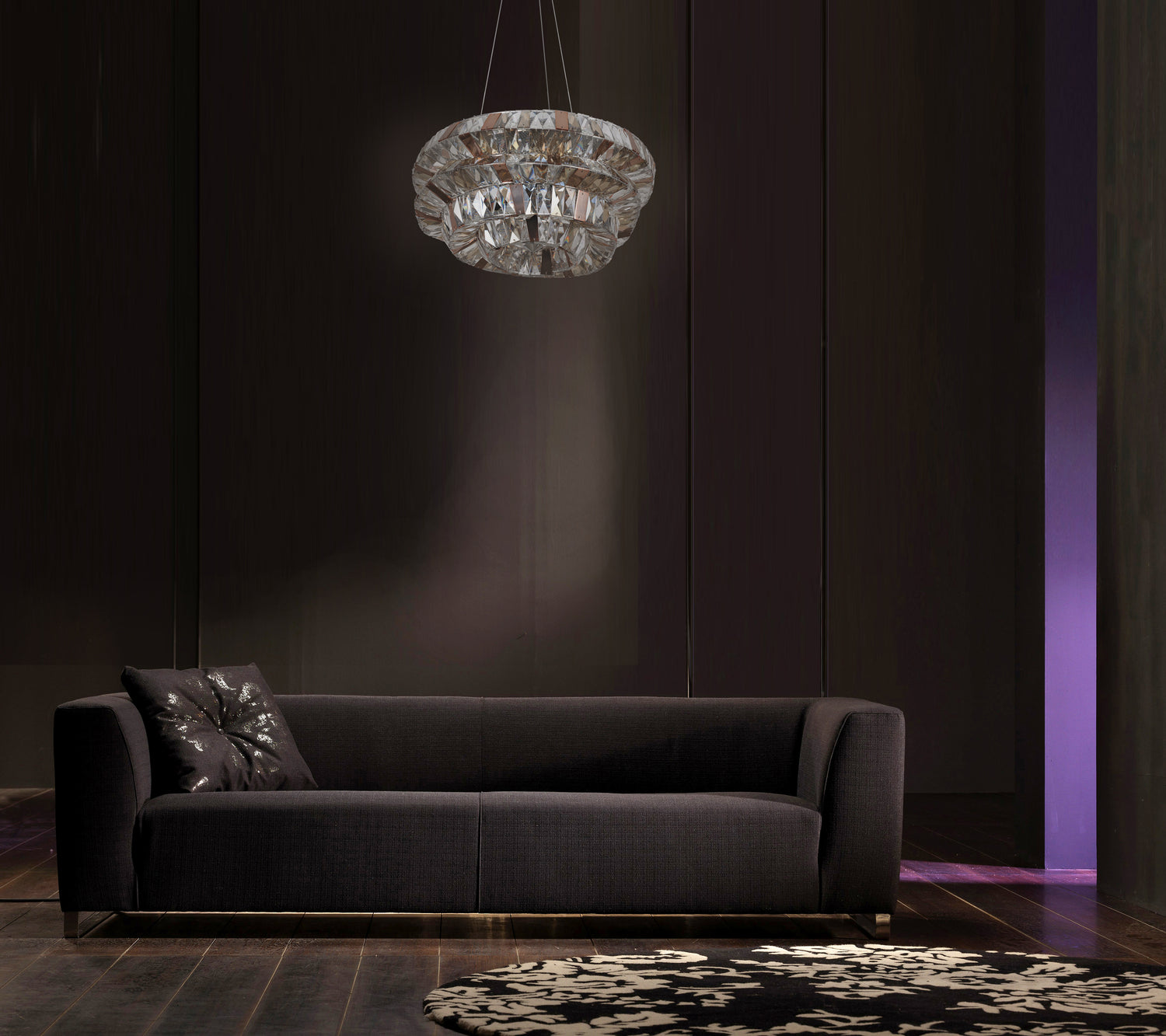 Inspired by Frank Gehry's architectural designs, this collection features an eclectic framework, accentuated with faceted rectangular clear and bronze crystals along with metallic panels. This collection comes fully dressed with limited assembly required.