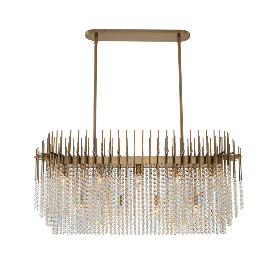 In the Array collection, many slender metal rods in a Brushed Champagne Gold finish hold strands of delicate faceted crystal beads for a look that’s dramatic and artistic. Array brings a glamorous warmth to a modern home.