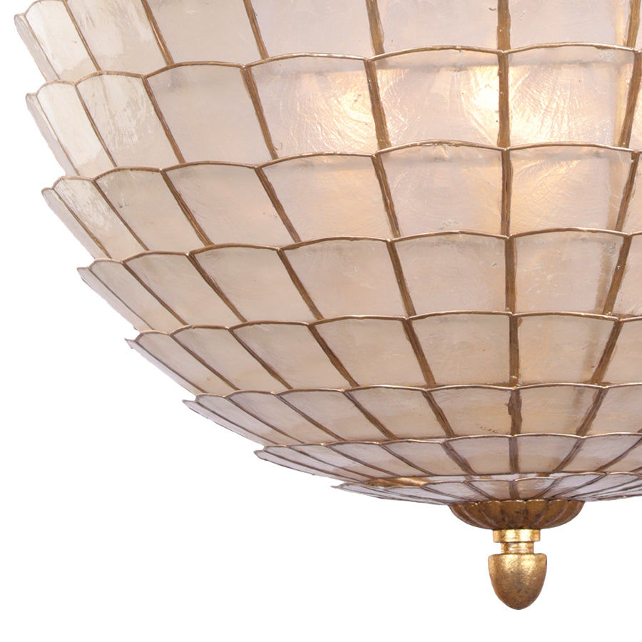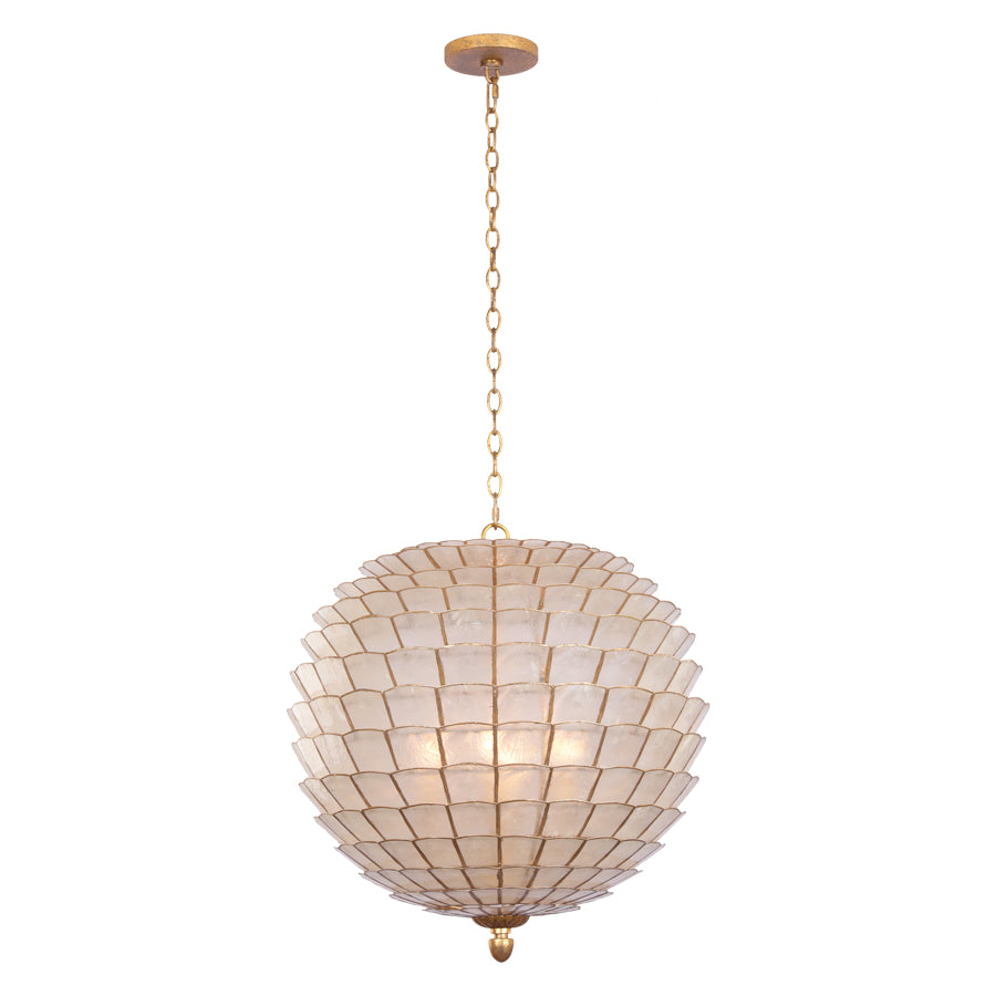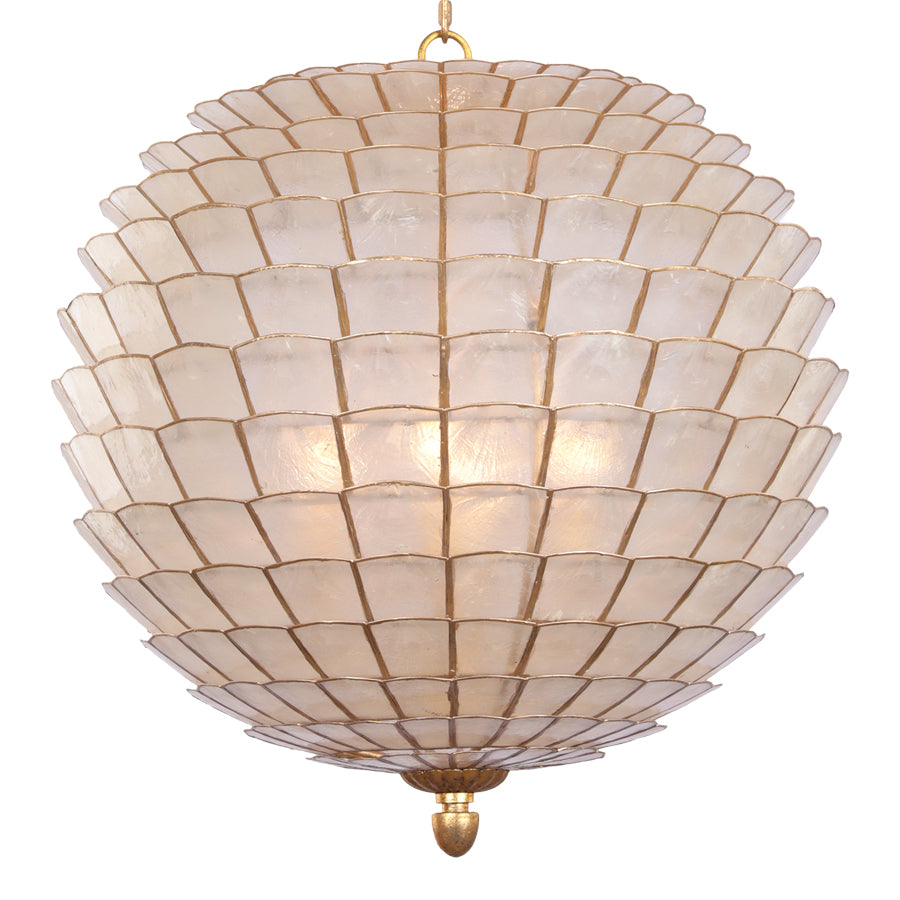 A contemporary Scandinavian artichoke silhouette gets a transitional makeover in this collection, where natural capiz shells are held in place by an Oxidized Gold Leaf finished frame.