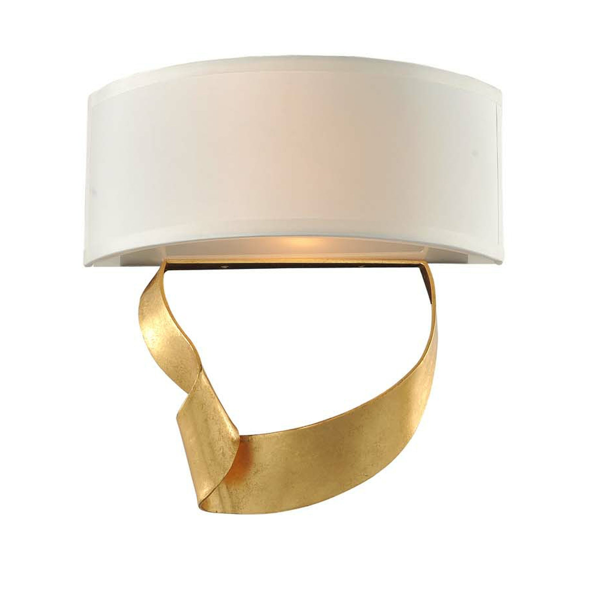 This handcrafted metal wall sconce features a flowing ribbon detail and white linen shade. The light fixture is finished in Roman Gold and available in a right or left version to create balance in any application.