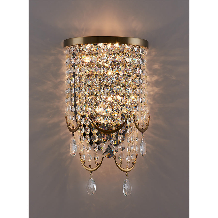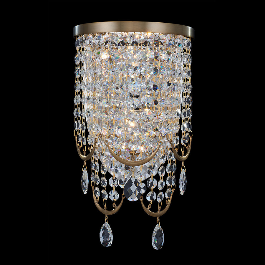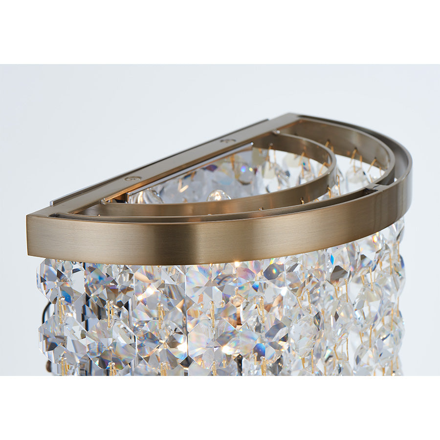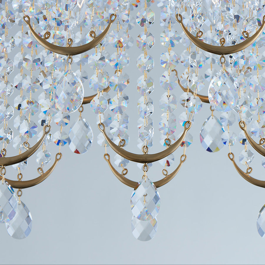 Bohemian inspired layers and brushed champagne gold curved cast brass hardware create a stunning pattern of cascading crystals. Strands of clear Firenze octagon crystal gradually decrease in size to highlight each piece of hardware, the canopy has single crystal ornaments to carry the look through from eye level to ceiling.