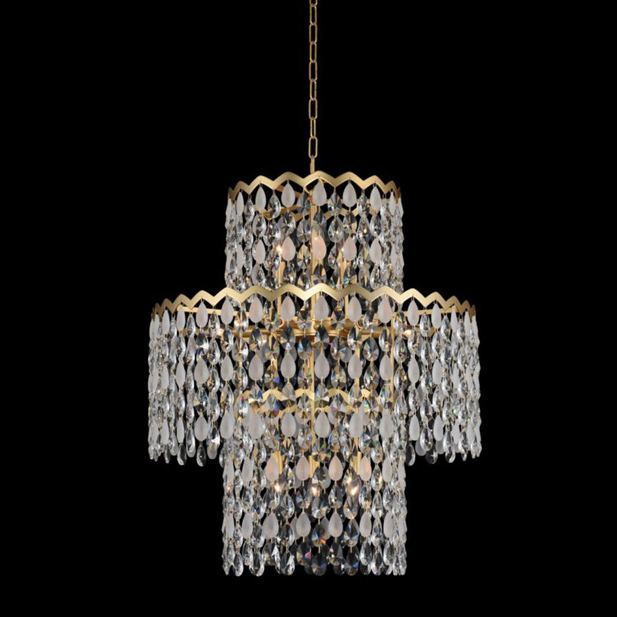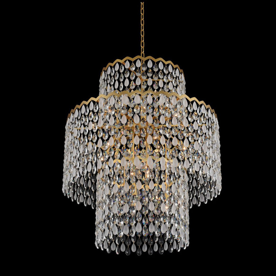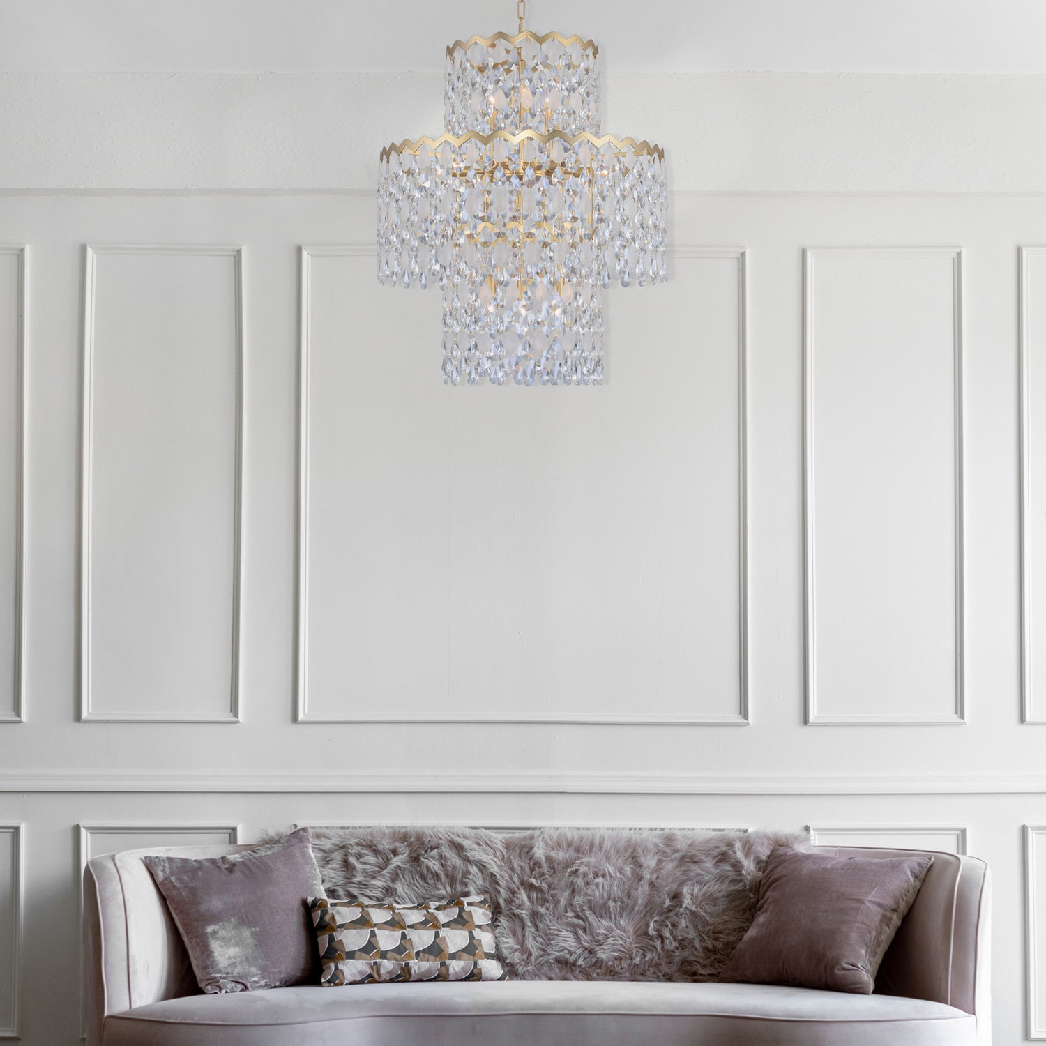 The Charm collection features a scalloped frame in a bright antique brass finish with both frosted and clear Firenze crystal drops.