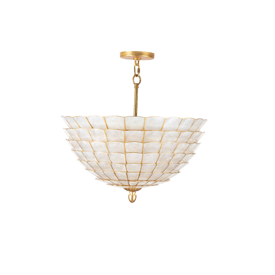 A contemporary Scandinavian artichoke silhouette gets a transitional makeover in this collection, where natural capiz shells are held in place by an Oxidized Gold Leaf finished frame.