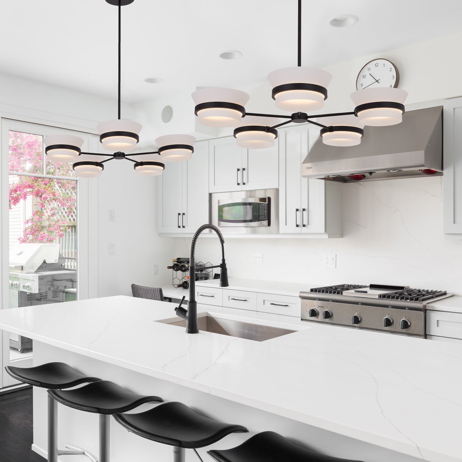 The Anel collection makes the disappearing silhouette a luxury staple with white frosted floating glass shades nested in a classic Matte Black frame.