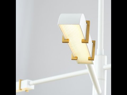A futuristic low profile silhouette paired with articulating arms for a perfect positioning. The petite fixture heads feature a reeded glass diffuser, the heads can be rotated to point upward of downward to direct the light.
