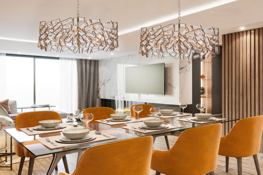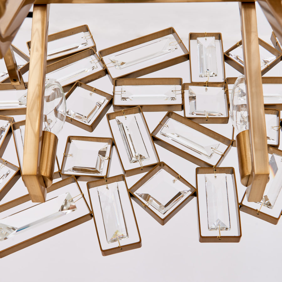 Modular inspired design with a futuristic appeal. This collection of light fixtures plays with shapes using classic clear rectangular and square crystal baguettes. Offered in a warm Winter Brass finish, you will find pendants, an island light, and a wall sconce in this series of fixtures.