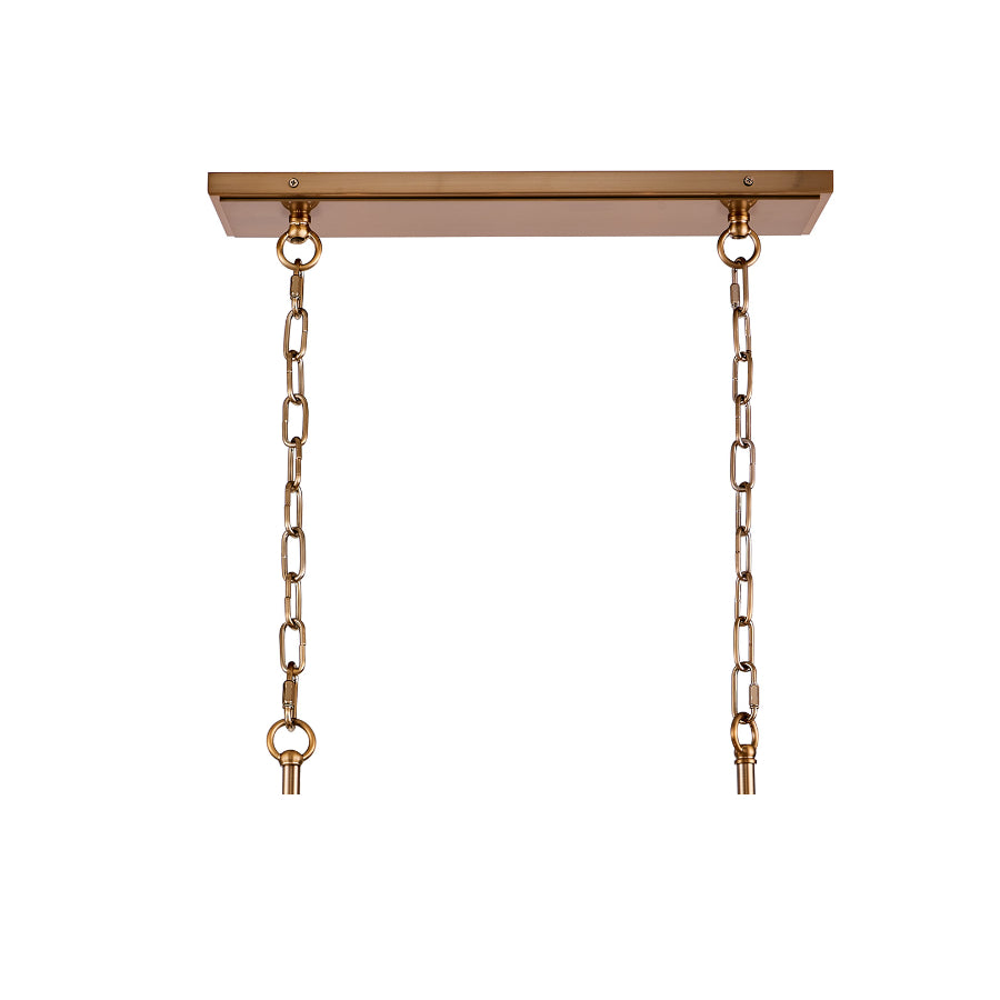 Modular-inspired design with a futuristic appeal. This island light plays with shapes using classic clear rectangular and square crystal baguettes. Offered in a warm Winter Brass finish.