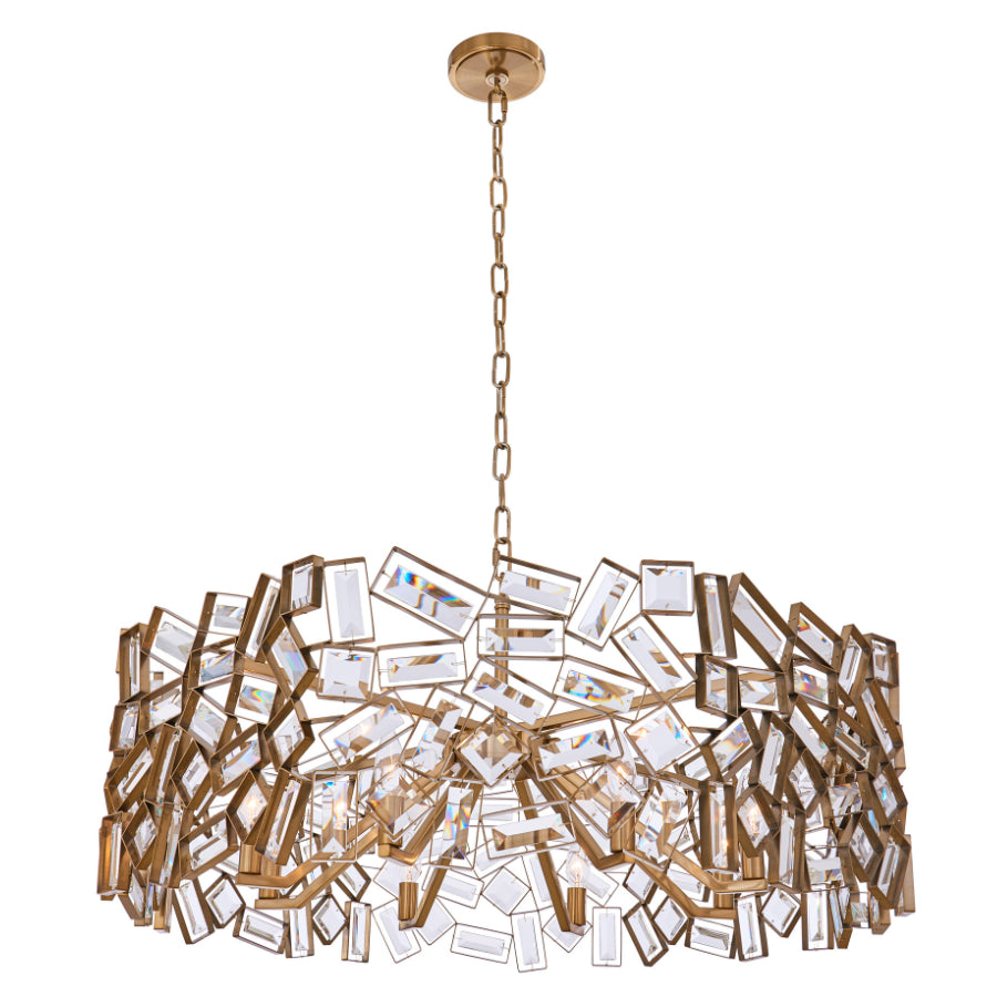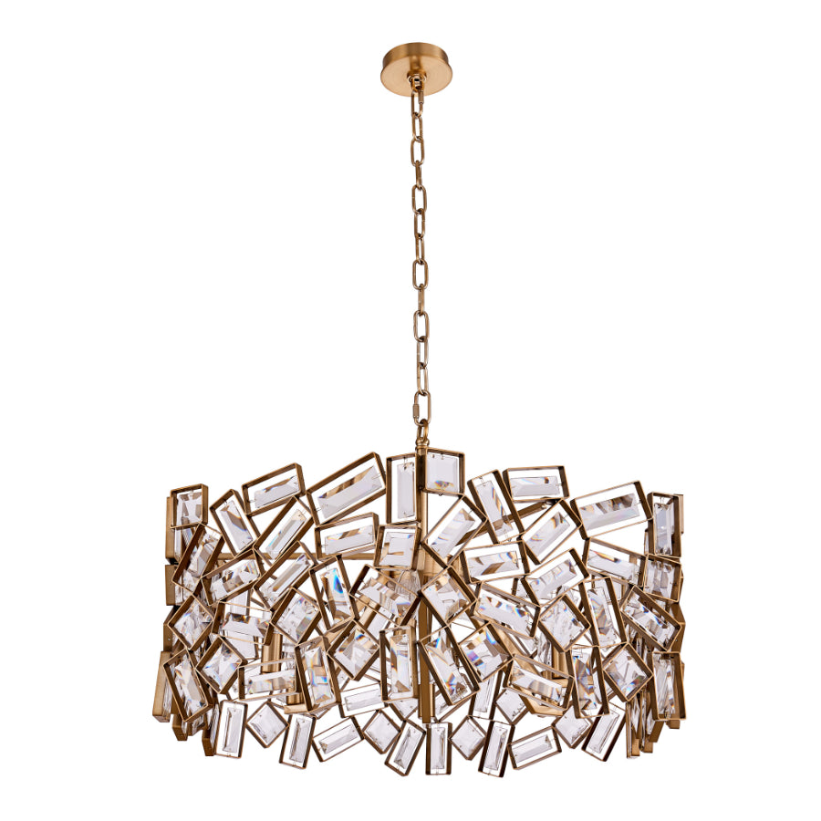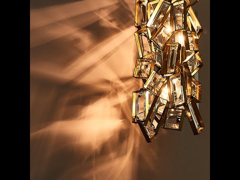 Modular inspired design with a futuristic appeal. This collection of light fixtures plays with shapes using classic clear rectangular and square crystal baguettes. Offered in a warm Winter Brass finish, you will find pendants, an island light, and a wall sconce in this series of fixtures.