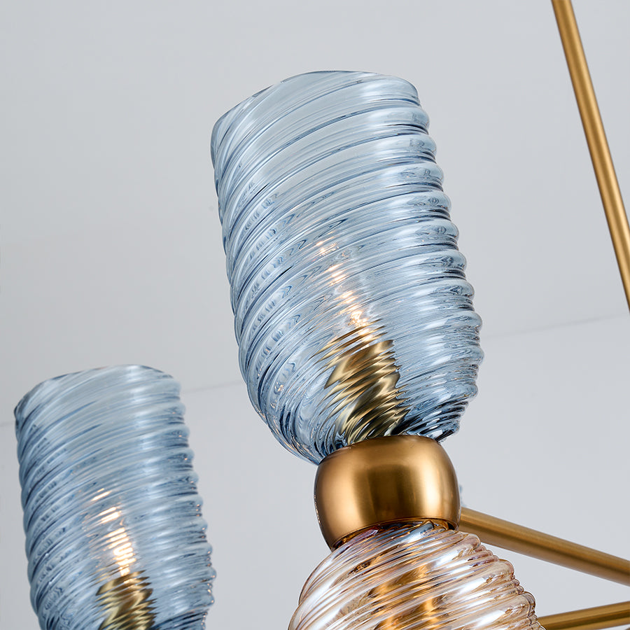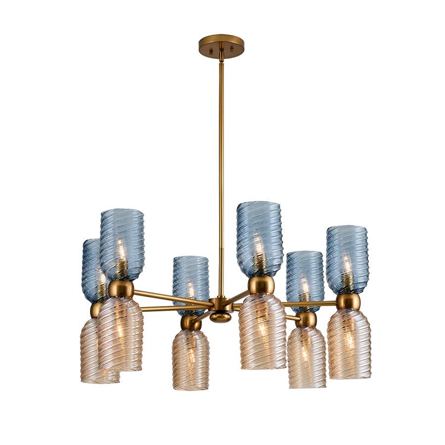 The perfect pairing of cool navy blue and a warm iridescent peach make a statement in color combinations. The glass shades feature a natural twisted texture and the rounded holder with a pebble finial add soft accents in a classic aged gold finish.