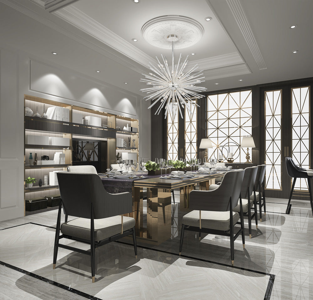 It's polished silver frame capped with crystal rods that refract the light to provide more shimmer and the dimensional look that's created with the candelabra bulbs layered in gives this fixture a high design look.
