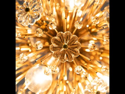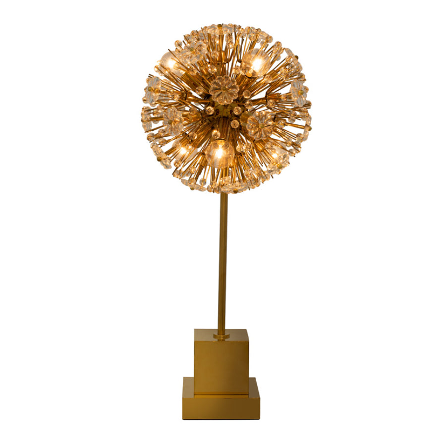 This sweet and whimsical table lamp playfully showcases clear crystal florets and beads in an orb silhouette resembling a dandelion. Authentic crystal and a warm gold finish boast a Hollywood glam vibe.